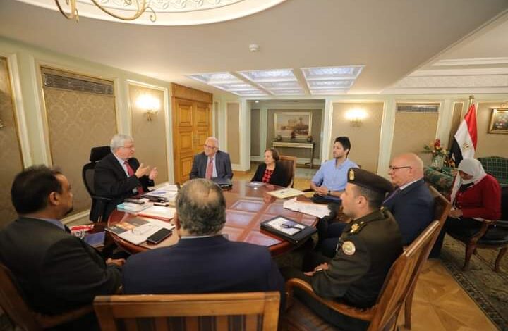 الدكتور حسام فهمي مقرر اللجنة العلمية لمكافحة فيروس كورونا والوفد المرافق له وبحضور الدكتور حسام عبدالغفار أمين المجلس الأعلى للمستشفيات الجامعية لمُناقشة خُطوات استكمال تصنيع اللقاح المصري المُضاد لفيروس كورونا، وذلك بمقر الوزارة.