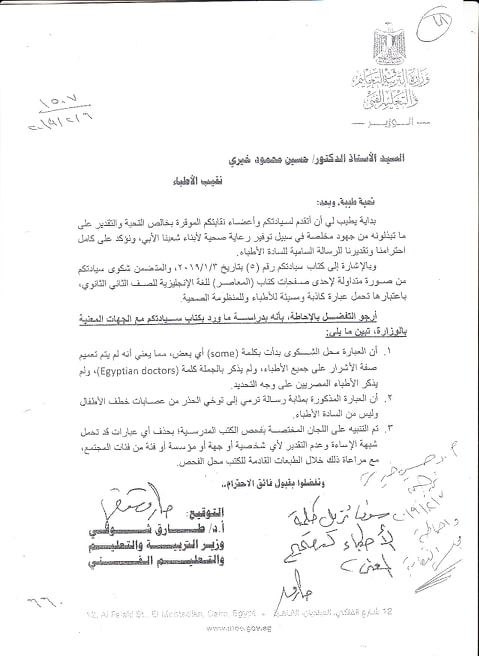 جاء ذلك رداُ على الشكوى التى سبق وتقدمت بها نقابة الأطباء الى وزارة التربية والتعليم إعتراضاً على الإساءة الواردة فى كتاب اللغة الإنجليزية للصف الثانى الثانوى( المعاصر ) والذى حمل عبارة مسيئة للأطباء وللمنظومة الصحية بوصفهم بالأشرار