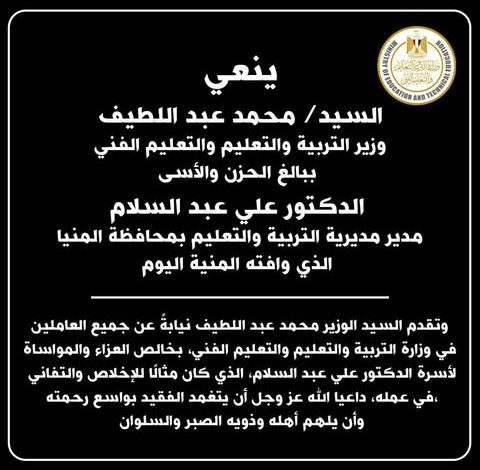 وزير التعليم ينعي مدير مديرية التربية والتعليم بمحافظة المنيا