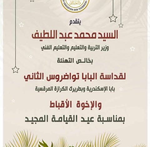 تقدم الأستاذ محمد عبد اللطيف، وزير التربية والتعليم والتعليم الفني، بخالص التهنئة لقداسة البابا تواضروس الثاني، بابا الإسكندرية وبطريرك الكرازة المرقسية، ولجميع الإخوة الأقباط بمناسبة حلول عيد القيامة المجيد.