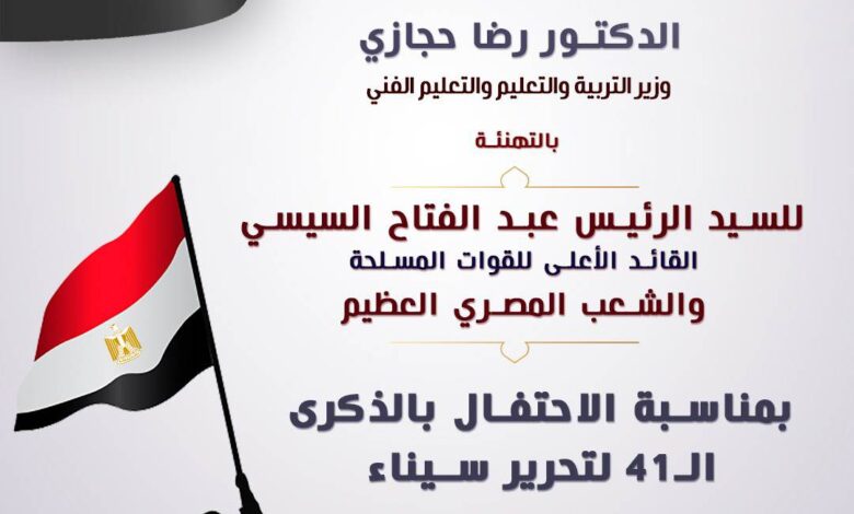 يتقدم الدكتور رضا حجازي وزير التربية والتعليم والتعليم الفني بالأصالة عن نفسه وبالإنابة عن جموع العاملين بالوزارة والمعلمين، بأسمى آيات التهاني للسيد الرئيس عبد الفتاح السيسي القائد الأعلى للقوات المسلحة والشعب المصري العظيم بمناسبة الاحتفال بالذكرى الـ٤١ لتحرير سيناء..تلك الذكرى التي جسدت أروع معاني البطولة والتضحيات لأبطالنا من رجال القوات المسلحة لاستعادة بقعة غالية من أرض الوطن.