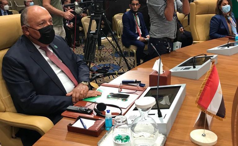 وصرَّح السفير أحمد حافظ المُتحدث الرسمي باسم وزارة الخارجية أن الوزير شكري أكدَّ خلال كلمته على الدور الهام المنوط بدول الجوار في إطار الحرص على استتباب الأوضاع الأمنية والسياسية في ليبيا، وتحقيق التطلعات المشروعة للشعب الليبي الشقيق نحو بناء دولته المُستقرة. كما أشاد الوزير شكري بما حققته لجنة 5+5 العسكرية المشتركة، وآخرها فتح الطريق الساحلي بين الشرق والغرب، ومن ثمَّ ضرورة توفير الدعم الكامل لها من أجل استكمال مهامها المُختلفة، بما في ذلك ضمان خروج كافة القوات الأجنبية، وكذا المقاتلين الأجانب والمرتزقة.