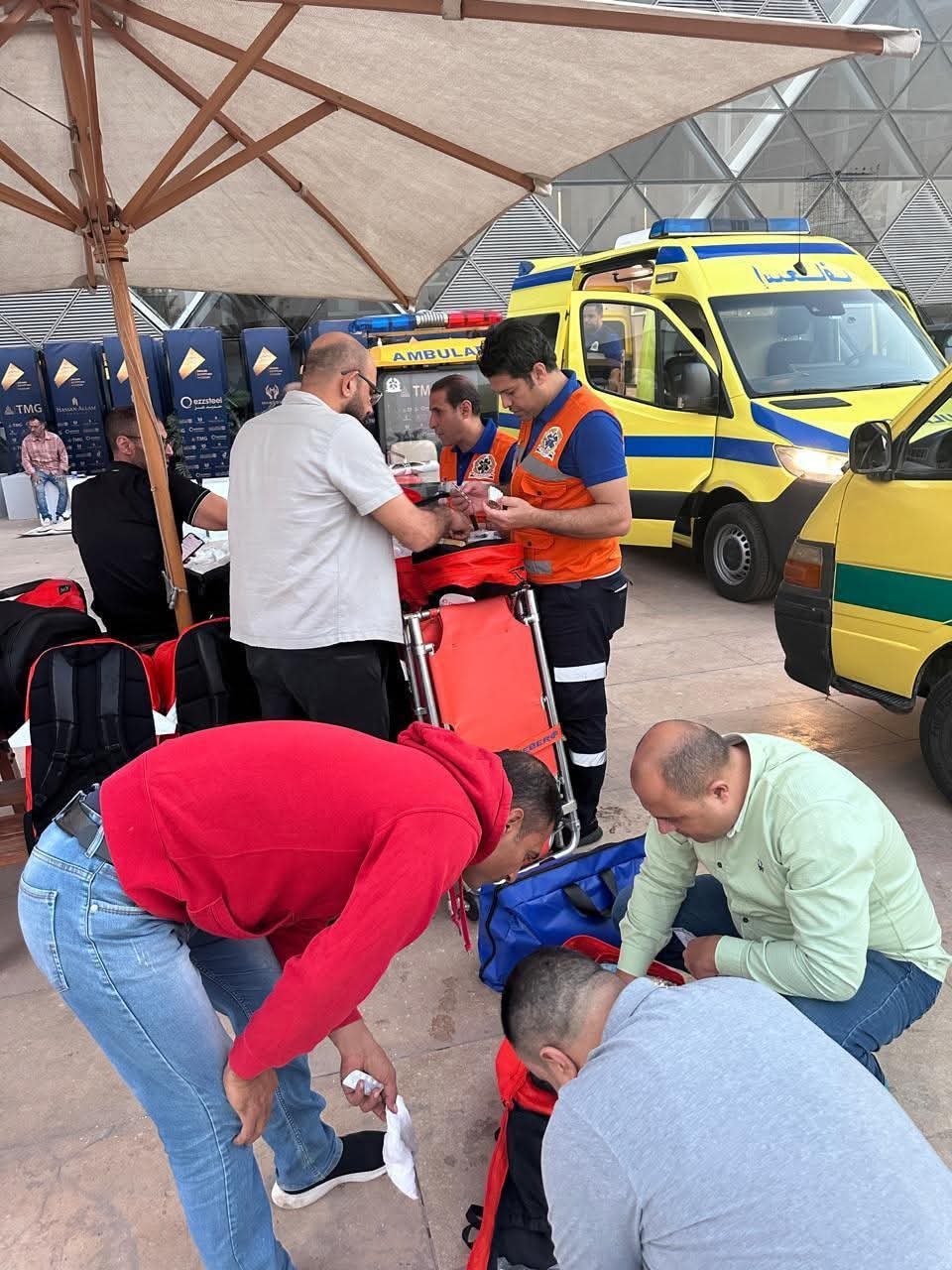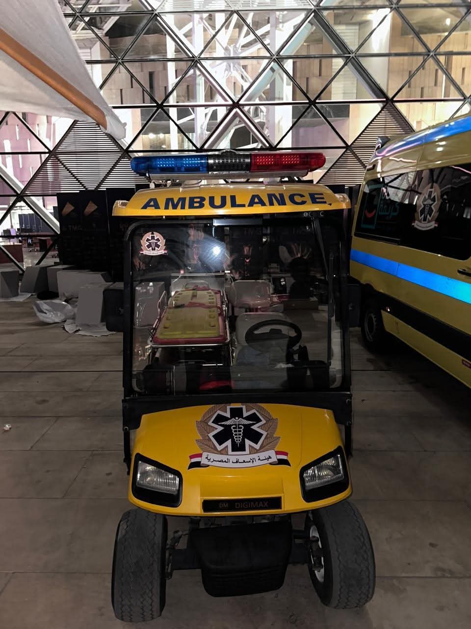 * نشر 8 سيارات إسعاف حديثة ومزودة بمعدات الإنعاش والإسعاف الأولي داخل المتحف، بالإضافة إلى 15 سيارة متمركزة في نقاط استراتيجية حول المتحف، لضمان الوصول السريع إلى أي موقع داخل أو خارج المبنى