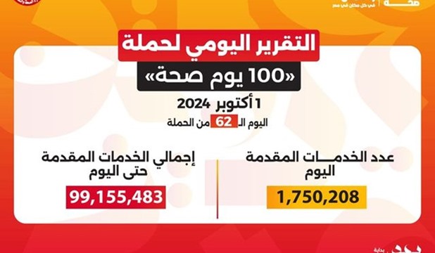 وأوضح الدكتور حسام عبدالغفار المتحدث الرسمي لوزارة الصحة والسكان، أن الحملة قدمت أمس، مليون و750 ألفاً و208 خدمات، مضيفا أنه وفقا لتقسيم خدمات القطاعات والهيئات والمبادرات المختلفة، فإن حملة «100 يوم صحة» قدمت 638 ألفا و294 خدمة، من خلال قطاع الرعاية الأساسية وتنظيم الأسرة.