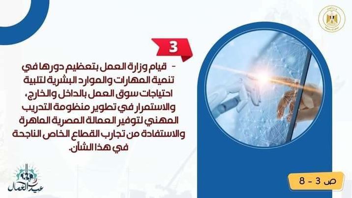 3- قيام وزارة العمل بتعظيم دورها في تنمية المهارات والموارد البشرية لتلبية احتياجات سوق العمل بالداخل والخارج والاستمرار في تطوير منظومة التدريب المهني لتوفير العمالة المصرية الماهرة والاستفادة من تجارب القطاع الخاص الناجحة في هذا الشأن.