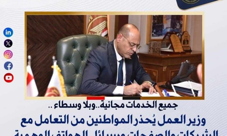 وزير العمل يُحذر المواطنين من التعامل مع الشركات والصفحات ورسائل الهواتف الوهمية
