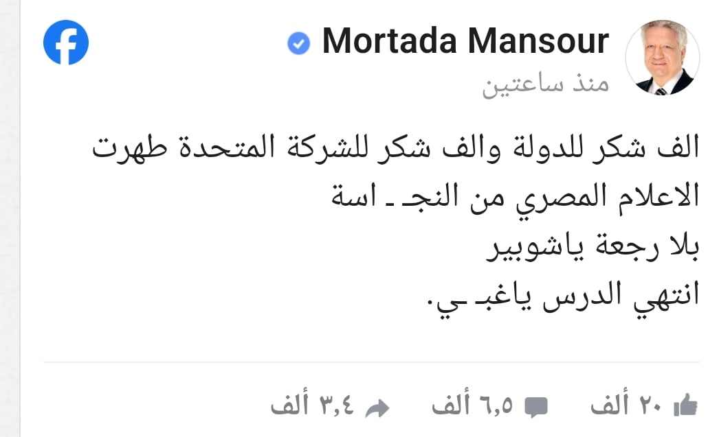 علق مرتضى منصور رئيس الزمالك السابق قائلا: «ألف شكر للدولة وألف شكر للشركة المتحدة طهرت الإعلام المصري.. بلا رجعة يا شوبير.. انتهي الدرس