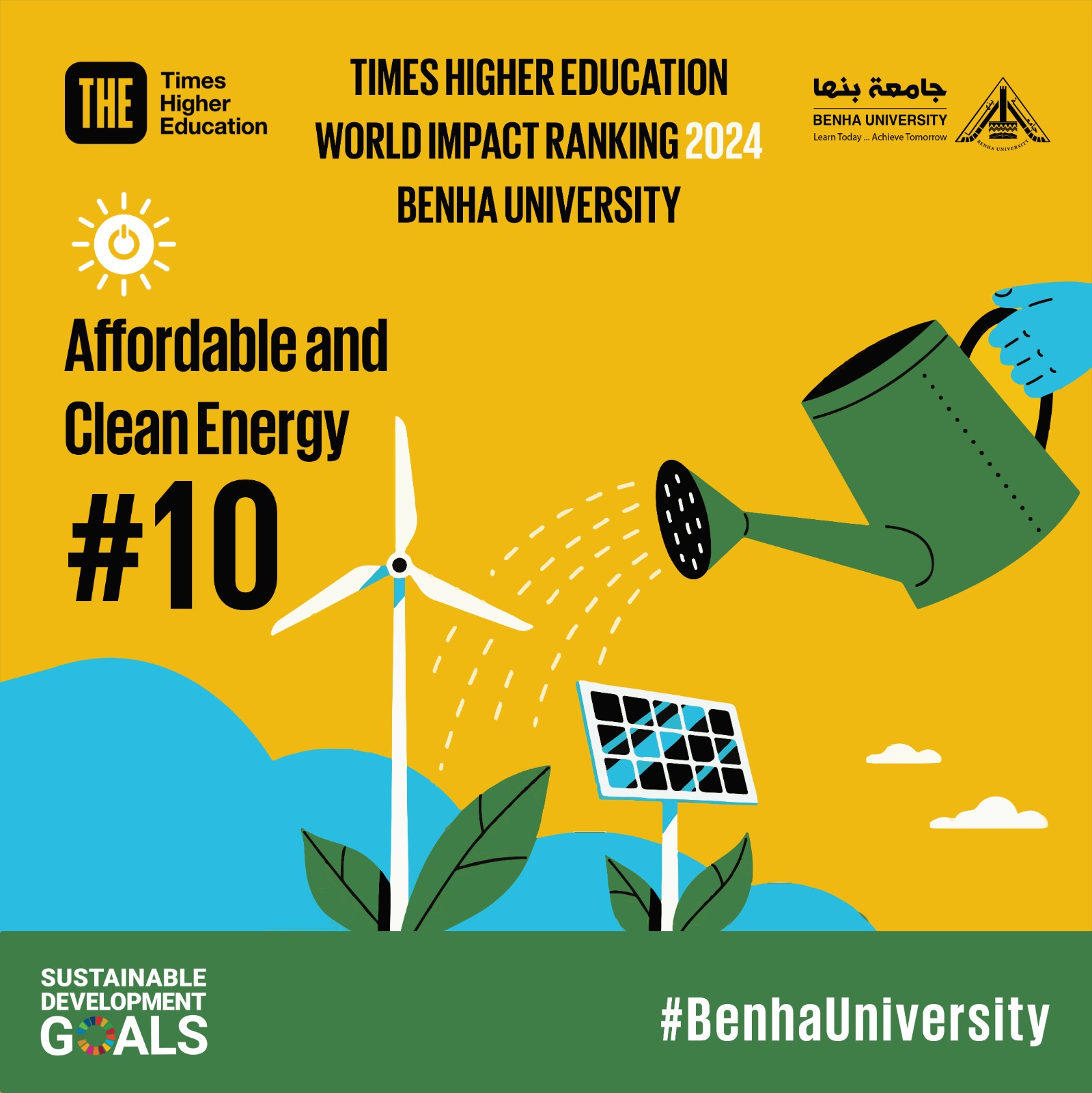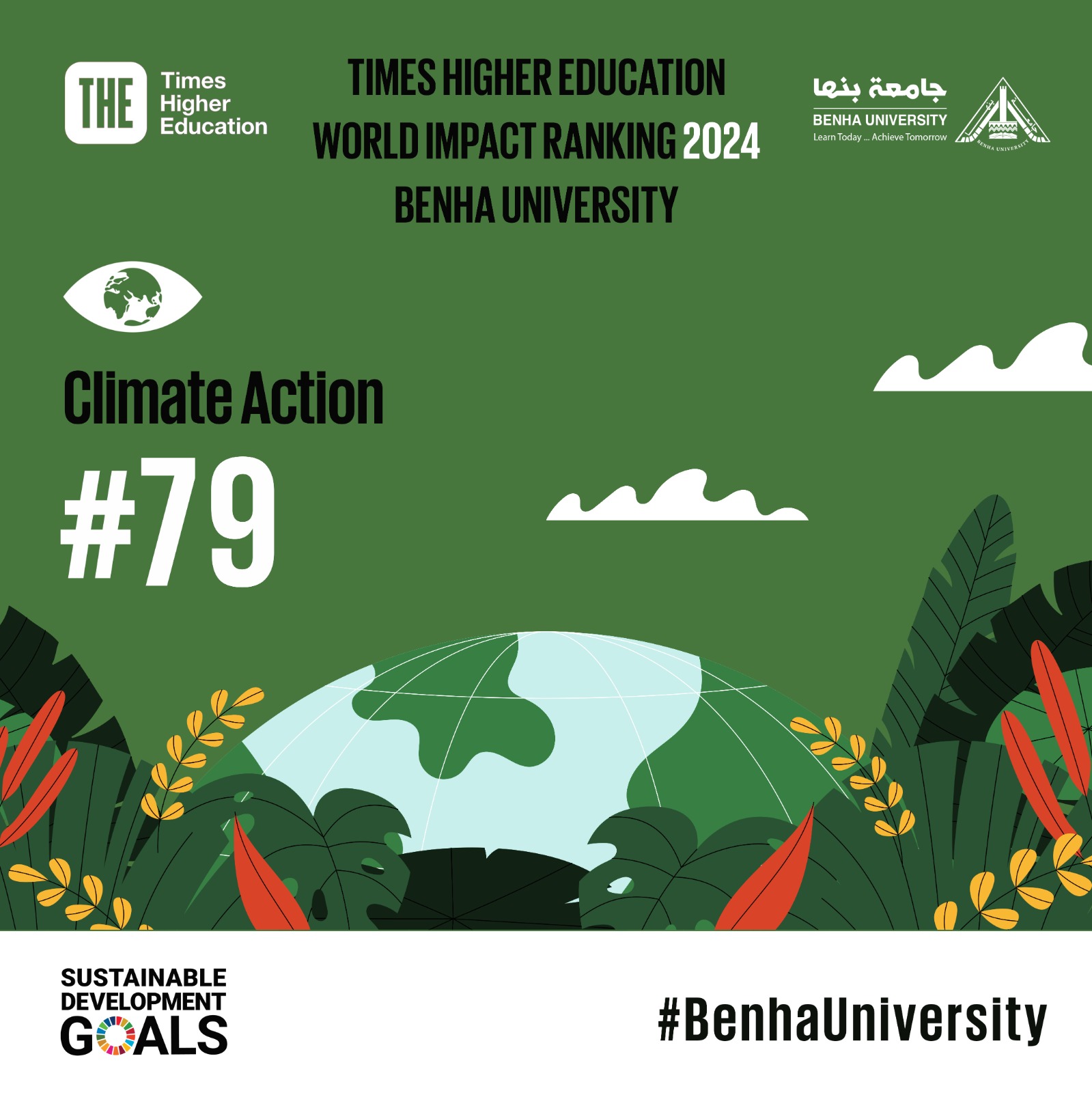 وأكد التقرير أن جامعة بنها صنفت ضمن أفضل 10 جامعات عالمية بتصنيف التايمز البريطاني للتأثير والمعنى بتحقيق أهداف التنمية المستدامة وذلك في تحقيق الهدف السابع الطاقة النظيفة والمركز 79 عالميا في تحقيق الهدف 13 والمعني بتغير المناخ ، كما احتلت الجامعة الترتيب 209 عالميا في التصنيف الاندونيسي للجامعات الخضراء الصديقة للبيئة.