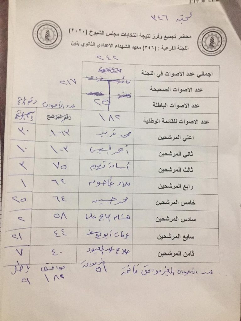 كشف رصد لفرز الاصوات باللجنة الفرعية (346 ) لمعهد الشهداء الاعدادي الثانوي بنين
