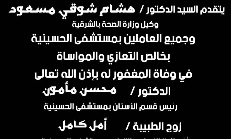بقلوب مؤمنة بقضاء الله وقدره، وبمزيد من الحزن والأسي، يتقدم الدكتور هشام شوقي مسعود، وكيل وزارة الصحة بالشرقية، والعاملين بمديرية الشئون الصحية بالشرقية، وجميع العاملين بمستشفي الحسينية المركزي، بخالص العزاء في وفاة المغفور له بإذن الله تعالي الزميل الطبيب محسن مصطفي مأمون رئيس قسم الأسنان بمستشفي الحسينية المركزي، وزوج الطبيبة أمل محمد كامل أخصائية النساء والتوليد بالمستشفي، والذي وافته المنية منذ دقائق قليلة إثر سقوطه من علو، سآلين المولي عز وجل أن يتغمد الفقيد بواسع رحمته، ويسكنه فسيح جناته، ويلهم أهله وذويه الصبر والسلوان، وإنا لله وإنا اليه راجعون.