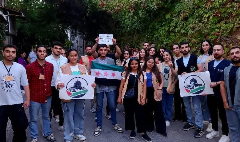 اقام مجموع من الناشطين في مدينة مصياف بريف حماة السورية وففة رافضة للتطبيع مع الاحتلال الاسرائيلي.