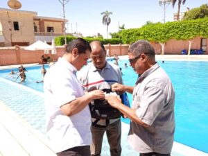 وكيل مديرية الشباب والرياضة بأسيوط للرياضة ومحمد السباعي مدير الهيئات بمديرية الشباب والرياضة باسيوط محمود انور مسئول التسويق بمديرية الشباب والرياضة باسيوط وحسين احمد مسئول الأزمات بمديرية الشباب والرياضة باسيوط لمتابعة حمامات السباحة ومطابقة الشروط والاكواد وعوامل الأمن والسلامة.