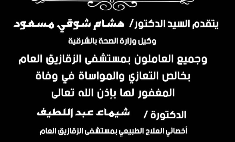 وكيل صحة الشرقية يعزي أسرة د. شيماء عبد اللطيف أخصائي العلاج الطبيعي
