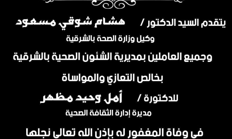 وكيل صحة الشرقية يعزي مديرة إدارة الثقافة الصحية بأبوكبير في وفاة نجلها