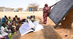 في أحد مراكز النزوح، كانت طفلة تقف أمام متطوعة تحمل دفاتر جديدة. سألتها المتطوعة: