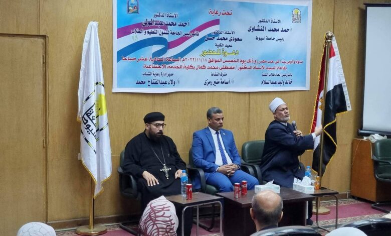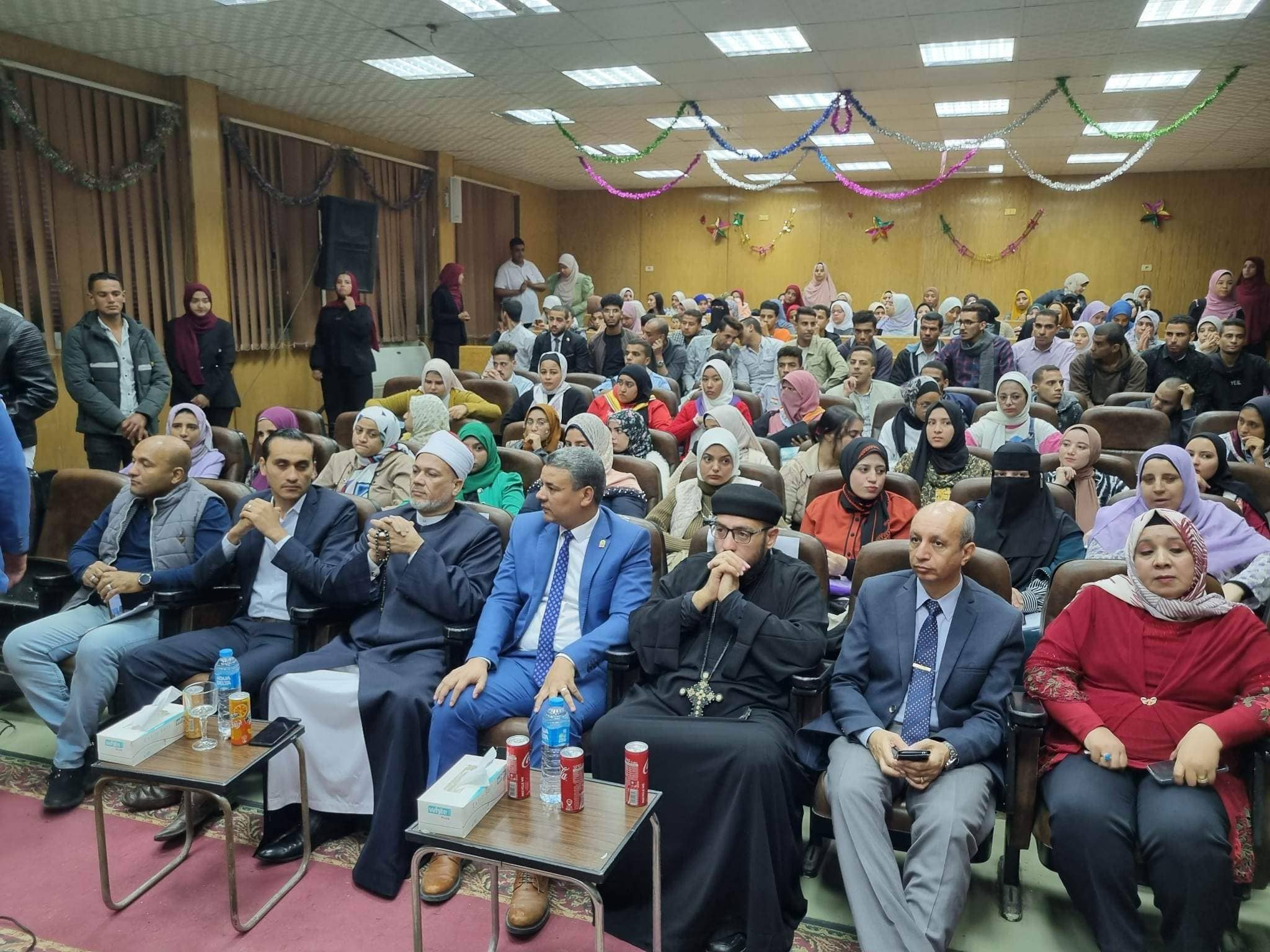 وذلك بحضور الشيخ عاصم قبيصي وكيل وزارة الأوقاف بأسيوط والأب عاموس بسطا أمين مساعد بيت العائلة المصرية بأسيوط وحضور عدد من أعضاء هيئة التدريس ومعاونيهم بالكلية ورعاية الشباب واتحاد الطلاب.