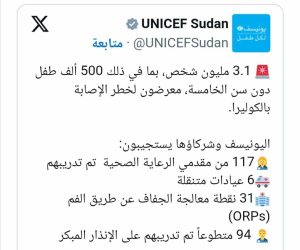 يونيسيف”: 3 ملايين شخص فى السودان معرضون لخطر الإصابة بالكوليرا