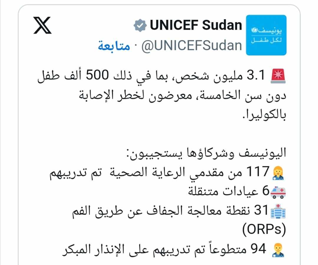 حذرت منظمة الأمم المتحدة للطفولة “يونيسيف” من أن ثلاثة ملايين شخص فى السودان معرضون لخطر الكوليرا، بما فى ذلك نصف مليون طفل دون سن الخامسة.