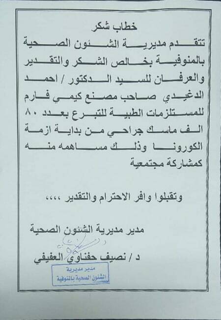 تقدم اليوم الدكتور نصيف حفناوى العفيفى وكيل وزارة الصحة بالمنوفية بشكر للدكتور أحمد الدغيدى صاحب مصنع كيمى فارم لتبرعه ب٨٠ ألف كمامة للمستشفيات