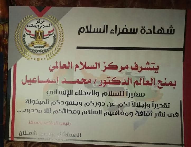 تهنئة الدكتور محمد اسماعيل بحصوله على شهادة سفراء السلام