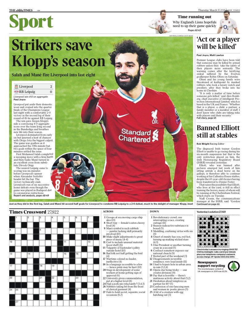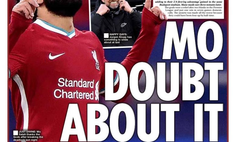 صور صلاح تتصدر الصحف البريطانية بعد صعود ليفربول لربع نهائي أبطال اوروبا