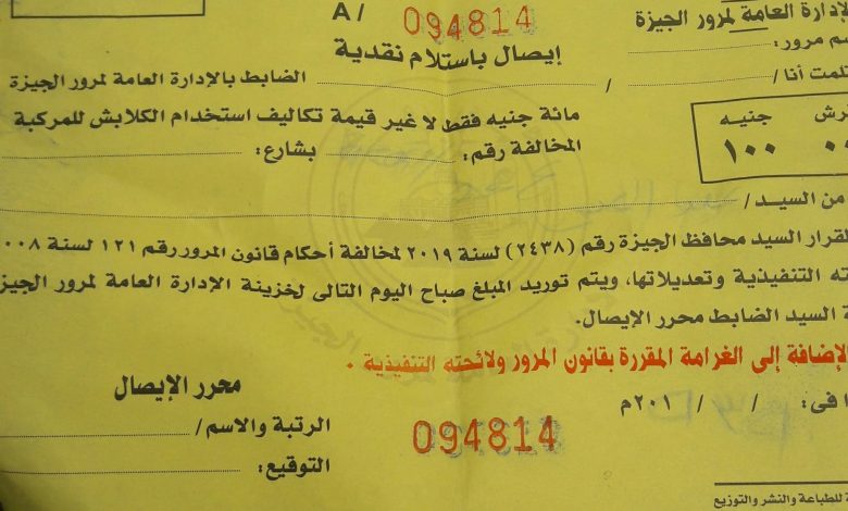 قال نعم فأعطيته ال 100 جنيه من جيبي ويقتلني الفضول لكي أرى نص المخالفة فى الإيصال..