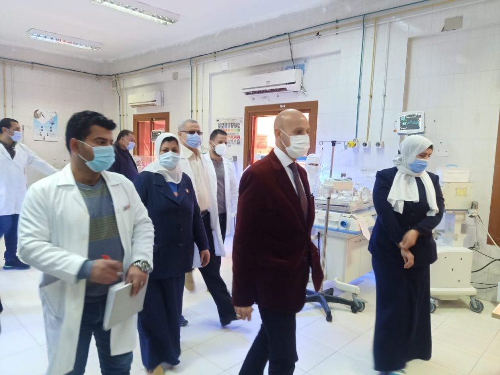 وتفقد قسم الإستقبال والطوارئ، وتم التأكد من توافر الأدوية والمستلزمات الطبية، والامصال وفصائل الدم المختلفة، وتابع سير العمل بقسم الحضانات، والأقسام الداخلية، والعناية المركزة للأمراض الباطنية والقلب، ووحدة الأشعة المقطعية،