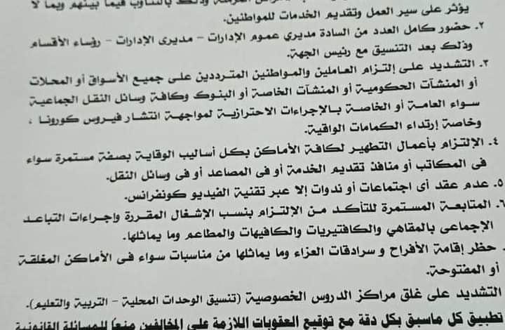 وشد اللواء ابو ليمون على كل المسئولين بضرورة المتابعة الدقيقة للالتزام بكل الإجراءات الاحترازية في الاسواق والشوارع وداخل المصالح الحكومية . مع المحافظة على عمليات التطهير والتعقيم لكل المرافق .