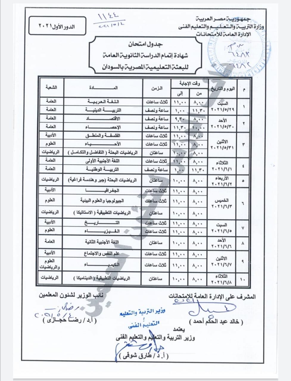اعتمد الدكتور طارق شوقى وزير التربية والتعليم والتعليم الفني، جدول امتحان الدور الأول 2021 لشهادة إتمام الدراسة الثانوية العامة لطلاب مدارس البعثة التعليمية المصرية بالسودان.