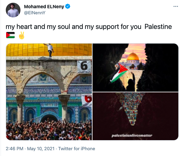وكان النني لاعب خط وسط نادي أرسنال رسالة دعم للشعب الفلسطيني على خلفية الأحداث في القدس وغزة.