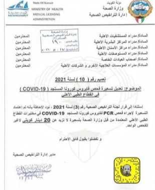وكانت الوكيل المساعد لشؤون الخدمات الطبية الأهلية بوزارة الصحة الدكتورة فاطمة النجار أوضحت أن هذا التخفيض جاء بناءً على اعتماد وزير الصحة الشيخ الدكتور باسل الصباح، قرار لجنة التراخيص الصحية رقم (3-2021)، استناداً إلى مراجعة أسعار فحص (PCR) الدولية والإقليمية.