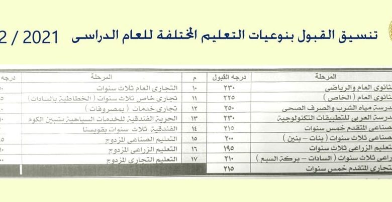 وأوضح أحمد سويد وكيل وزارة التربية والتعليم بالمنوفية بأن التنسيق شمل مدرسة مياه الشرب والصرف الصحي بمجموع (250) درجة ، مدرسة العربى للتطبيقات التكنولوجية بمجموع ( 230) درجة ، و ( 215 ) درجة للتعليم الصناعى المتقدم خمس سنوات و ( 200 ) درجة للتعليم الصناعى ثلاث سنوات بنين وبنات و ( 195 ) درجة للتعليم الزراعى ثلاث سنوات و ( 210 ) درجة للتعليم الزراعى ثلاث سنوات بالسادات وبركة السبع و ( 215 ) درجة للتعليم التجارى المتقدم خمس سنوات .
