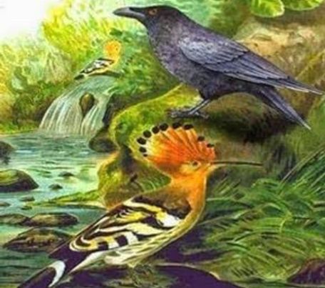 تنازع الهدهد والغراب يوماً على حفرة ماء، كلٌّ منهما يدّعي امتلاكها، واختصما ولم يستطيعا حلَّ الخلاف بينهما