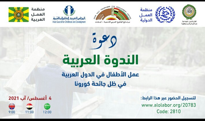 تعقد منظمة العمل العربية بالتعاون والتنسيق مع المجلس العربي للطفولة والتنمية ، والامانة العامة لجامعة الدول العربية ( القطاع الاجتماعي ) ، ومنظمة العمل الدولية الندوة العربية ندوة 4 أغسطس 2021 حول ” عمل الاطفال في الدول العربية في ظل جائحة كورونا”.
