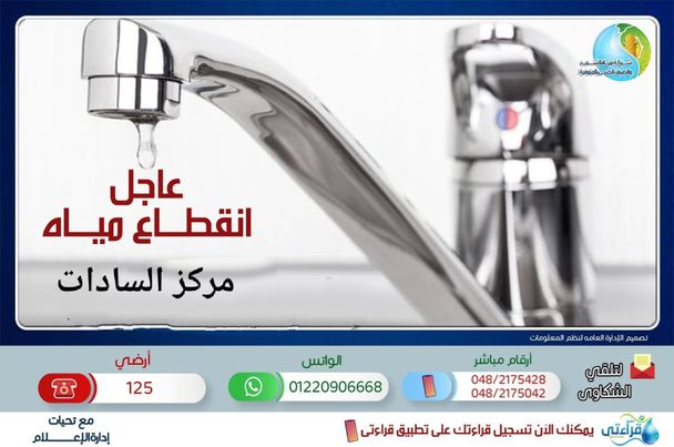 مياه المنوفية: قطع المياه يوم السبت عن مناطق بمركز السادات لـ 6 ساعات