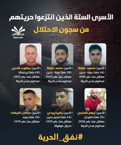 وحسب ماذكرته الأنباء ، فإن الأسرى الفارين هم: محمد قاسم عارضة، ويعقوب محمود قدري، وأيهم فؤاد كمامجي، ومحمود عبد الله عارضة، وقائد كتائب “شهداء الأقصى” التابعة لحركة “فتح” زكريا الزبيدي، إضافة إلى يعقوب انفيعات.