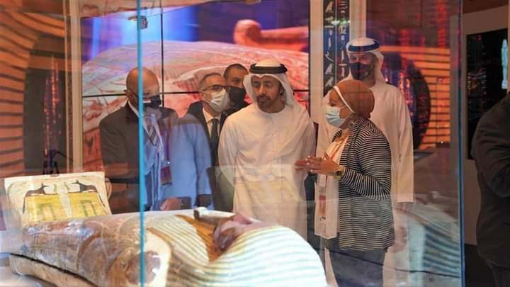 قام الشيخ عبدالله بن زايد وزير الخارجية والتعاون الدولي بدولة الامارات العربية المتحدة بزيارة للجناح المصري باكسبو 2020 دبي، حيث تفقد كافة المعروضات ومحتويات الجناح والتي تضمنت التابوت الفرعوني والمستنسخات الاثرية والشاشات التفاعلية حيث كان في استقباله السيد/ شريف البديوى السفير المصري بدولة الامارات العربية المتحدة والسفير/ اشرف الديب القنصل العام لمصر بدبي والوزير مفوض تجاري أشرف حمدي، رئيس المكتب التجاري المصري بدبي ونائب المفوض العام.