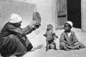 الحاوي وضع وعاء على الأرض لجمع ما يجود به المتفرج..ووضع لافتة بجانب الوعاء..لا تسرق القرد