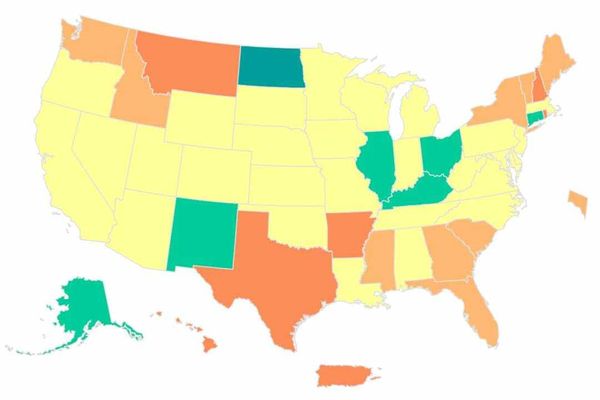 يشير اللون البرتقالي الداكن إلى الولايات التي زادت فيها إصابات كورونا في المستشفيات بنسبة تزيد عن 20 بالمائة، والبرتقالي الفاتح حيث زادت بنسبة تزيد عن 10 بالمائة، والأصفر حيث تكون إصابات كورونا في المستشفيات “مستقرة، و اللون الأخضر الفاتح حيث حدث انخفاض بنسبة 10 بالمائة، والأخضر الداكن حيث بلغ الانخفاض أكثر من 20 بالمائة.