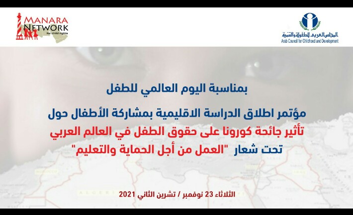يعقد المجلس العربي للطفولة والتنمية بالشراكة مع الشبكة العربية لحقوق الطفل “منارة” مؤتمر “إطلاق تقرير الدراسة الإقليمية بمشاركة الأطفال حول تأثير جائحة كورونا على حقوق الطفل في العالم العربي، تحت شعار: العمل من أجل الحماية والتعليم”، وذلك في الساعة الحادية عشر من صباح يوم الثلاثاء الموافق 23 نوفمبر 2021.