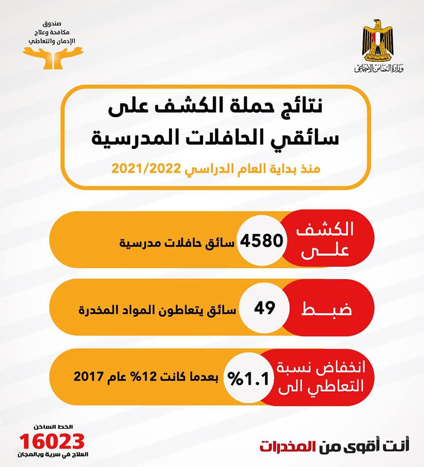 من جانبه أوضح عمرو عثمان مساعد وزيرة التضامن _ مدير صندوق مكافحة وعلاج الإدمان والتعاطى انه جارى تكثيف الحملات للكشف على سائقي الحافلات المدرسية ،حيث يتم تنفيذ الحملات بشكل مفاجئ طوال فتره الفصل الدراسي وانخفضت نسبة التعاطي بين سائقي الحافلات المدرسية لـ1.1 % بعدما كانت 12% عام 2017 وتستهدف الحملات الكشف على سائقي الحافلات المدرسية بالعديد من المحافظات ، ويتم اتخاذ الإجراءات القانونية اللازمة لمن يثبت تعاطيه للمواد المخدرة ،كما يتم أيضا التوسع في الحملات لاستهداف الكشف أيضا على سائقي حافلات نقل طلاب الجامعات والمعاهد العليا الخاصة وكذلك سائقي الحافلات الذين ينقلون طلاب المدارس الحكومية مع تكثيف حملات الكشف عن المخدرات على سائقي المدارس الخاصة بالمحافظات المختلفة ،خاصة المحافظات التي يوجد بها مدارس خاصة ولديها أتوبيسات لنقل الطلاب ،لافتا الى انه يتم إخطار وزارة التربية والتعليم بنتائج العينات التوكيدية لاتخاذ إجراءات الفصل لمن يثبت تعاطيه للمخدرات مع تحرير محاضر وإحالتها إلى النيابة بتهمة القيادة تحت تأثير المخدر.