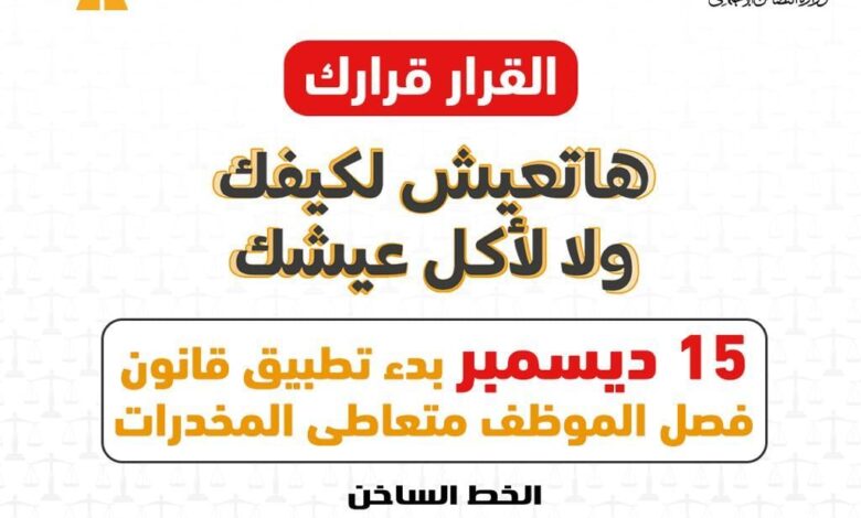 جدير بالذكر  بأن 448 ألف موظف خضعوا للكشف عن تعاطى المخدرات في الفترة من مارس 2019 ، وحتى نوفمبر  2021 في مختلف الوزارات ،وكذلك في المؤسسات والمديريات التابعة لهم بكافة المحافظات، وانخفضت نسبه التعاطى  الى 1.7% بعدما كانت 8% في بداية حملات الكشف ومن ثبت  تعاطيه للمواد تم إحالته الى النيابة الإدارية لاتخاذ الإجراءات القانونية اللازمة ،واعتبارا من يوم 15  ديسمبر الجارىً  سيتم تطبيق قانون فصل الموظف المتعاطى للمواد المخدرة مع التأكيد بأن من يطلب العلاج من الإدمان طواعية يتم اعتباره كمريض ويتم علاجه بالمجان وفى سرية تامة من خلال الخط الساخن لعلاج مرضى الإدمان “16023” ،ومن دون ذلك ويثبت تعاطيه للمواد المخدرة خلال نزول حملات الكشف بشكل مفاجيء سيتم تطبيق القانون عليه.