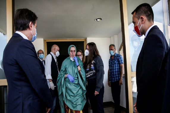 سيلفيا رفقة والدتها ورئيس الوزراء الإيطالي “جوزيبي كونتي” لحظة استقبالها بمطار روما