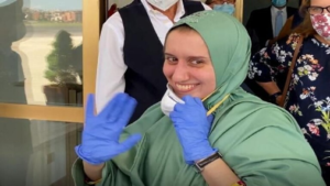 وبينما كان الإستعداد هائلا في مطار العاصمة الإيطالية روما حيث ينتظرها رئيس الوزراء الإيطالي “جوزيبي كونتي” برفقة وزير الخارجية “لويجي دي مايو” وأسرتها وحشد شعبي وإعلامي كبير، إذ هبطت الطائرة التابعة لوكالة المعلومات والأمن الخارجي الإيطالي”المخابرات” في مطار شيامبينو، وفُتح باب الطائرة، فظهرت “سيلفيا رومانو” تريدي زيًّا إسلاميًا أخضر بحجابها الإسلامي وكمامة وقفازات، وكانت المفاجأة المُدهشة لجميع الحاضرين لاستقبالها في المطار.