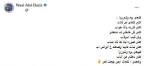 فقد نشر وائل عبدالعزيز على صفحته على موقع الفيسبوك صورة قديمة تجمعه مع شقيقته الفنانة الشهيرة، في مرحلة الشباب،ونشر تحت الصورة قصيدة قصيرة للشاعر أيمن بهجت قمر والتي يقول فيه :