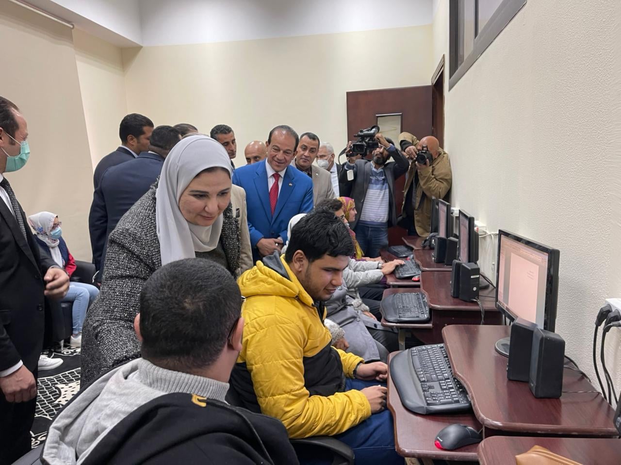 وتفقدت ورش تدريب الطلاب علي الحرف اليدوية، وتدريب الطلاب من ذوي الإعاقة خاصة البصرية والحركية على الإسعافات الأولية لحماية أنفسهم من أية طوارئ ولتقديم الإسعافات لغيرهم قدر استطاعتهم، كما شهدت تقديم فقرات حية من الغناء والعزف وعرض جزء من مسرحية لدعم مشروع إنشاء مستشفى 900 900 الجامعى الجديد للطلاب ذوي الهمم.