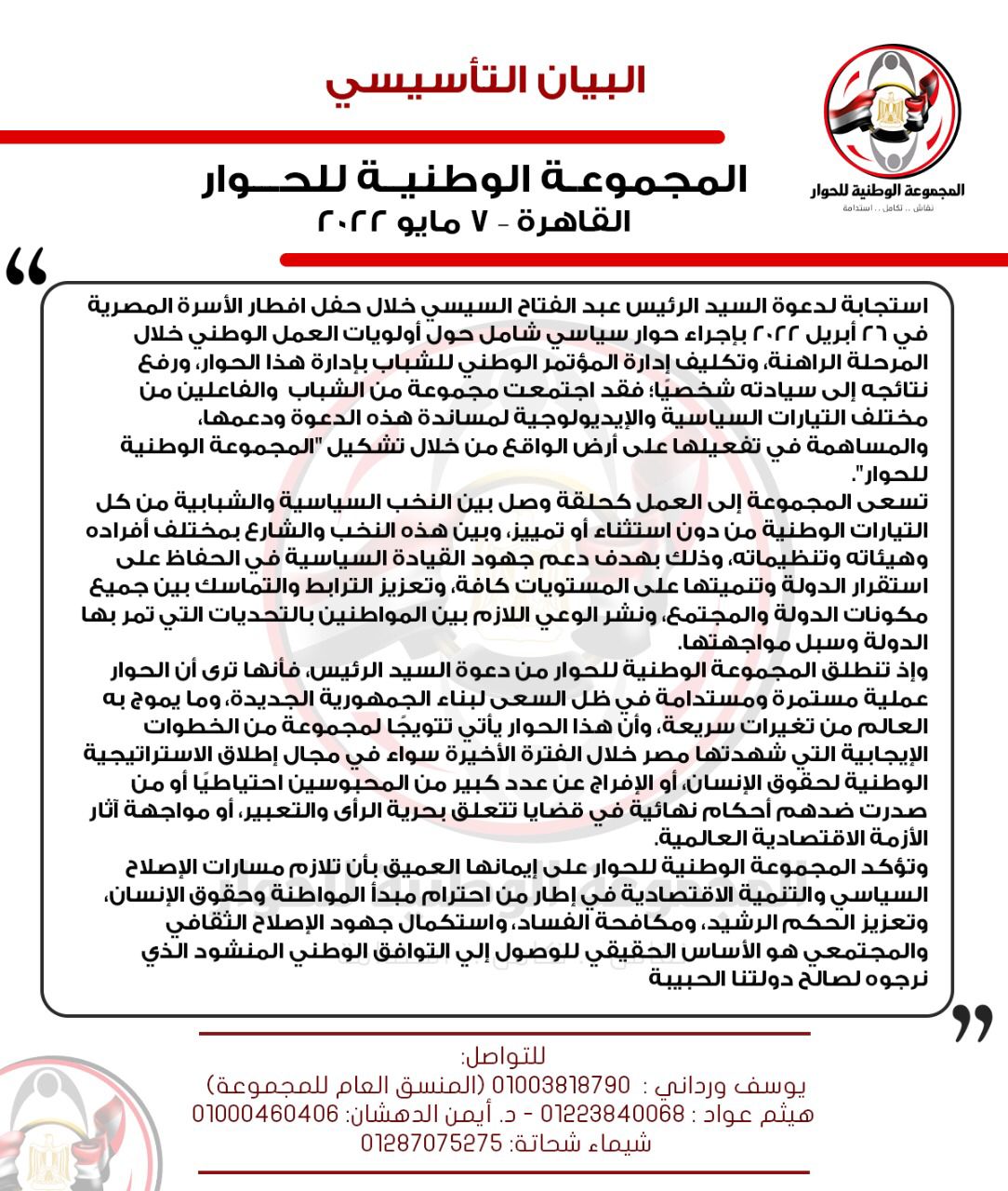 استجابة لدعوة الرئيس عبد الفتاح السيسي خلال حفل افطار الأسرة المصرية في 26 أبريل 2022 بإجراء حوار سياسي شامل حول أولويات العمل الوطني خلال المرحلة الراهنة، وتكليف إدارة المؤتمر الوطني للشباب بإدارة هذا الحوار، ورفع نتائجه إليه شخصيًا؛ فقد اجتمعت مجموعة من الشباب والفاعلين من مختلف التيارات السياسية والإيديولوجية لمساندة هذه الدعوة ودعمها، والمساهمة في تفعيلها على أرض الواقع من خلال تشكيل “المجموعة الوطنية للحوار” .