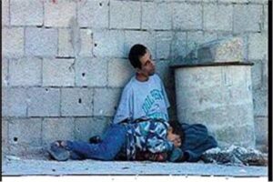 نفس المشهد من الدماء والأجساد المتفجرة عام 2000م نتيجة إطلاق أحدث الأسلحة على مرأى من شاشات العالم الرصاصات على الطفل الصغير وهو يختبي ببرائته في والده مسترحماً ظناً منه أن الجنود الصهاينة سيرحموا طفولته ولن يطلقوا عليه أي رصاص، لكن هيهات للهؤلاء القتلة المجرمين أن يرحموا طفلا صغيرا، وفوجئ الطفل ووالده بوابل من الرصاص يخترق جسد الطفل الصغير الضعيف فيمزقه تمزيقا ، وتبكي عليه الشعوب عبر شاشاتهم ، وتنادي هيئات حقوق الإنسان بمعاقبة المجرمين الذين قتلوا الطفل.