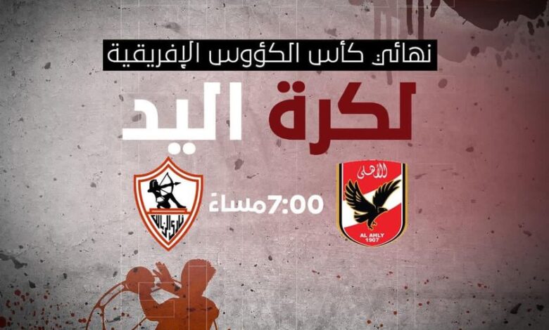 تقام مباراة الأهلي والزمالك في نهائي بطولة كأس الكوؤس الأفريقية يوم الخميس 19 مايو في تمام الساعة السابعة مساء بتوقيت القاهرة، وتنقلها قنات اون تايم الثانية