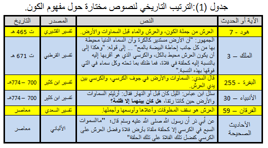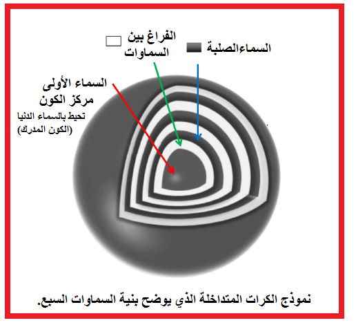 هل تتخيل أيها القاريء الكريم الحجم الحقيقي للكون الكبير؟ نحن نتكلم –والله أعلى وأعلم- عن السماوات السبع في صورة سبعة كرات متحدة المركز سماكة كل منها تساوي نصف قطر الكون المدرك، وبين كل سماء وسماء مسافة تناهز أيضا نصف قطر الكون المدرك… وكل ذلك كله من الكرسي عبارة عن حلقة ملقاة بأرض فلاة، والكرسي من العرش أيضا كحلقة ملقاة بأرض فلاة، فهل يحق لأي من البشر الضعفاء أن يتكبر أو يتجبر أمام هذا الخلق العظيم؟ ولعل الشكل رقم (1) وصورة غلاف المقال للكرات المتداخلة تقرب لكم الصورة وتساعدكم على التخيل (انظر بعض الأدلة على جدول 1).